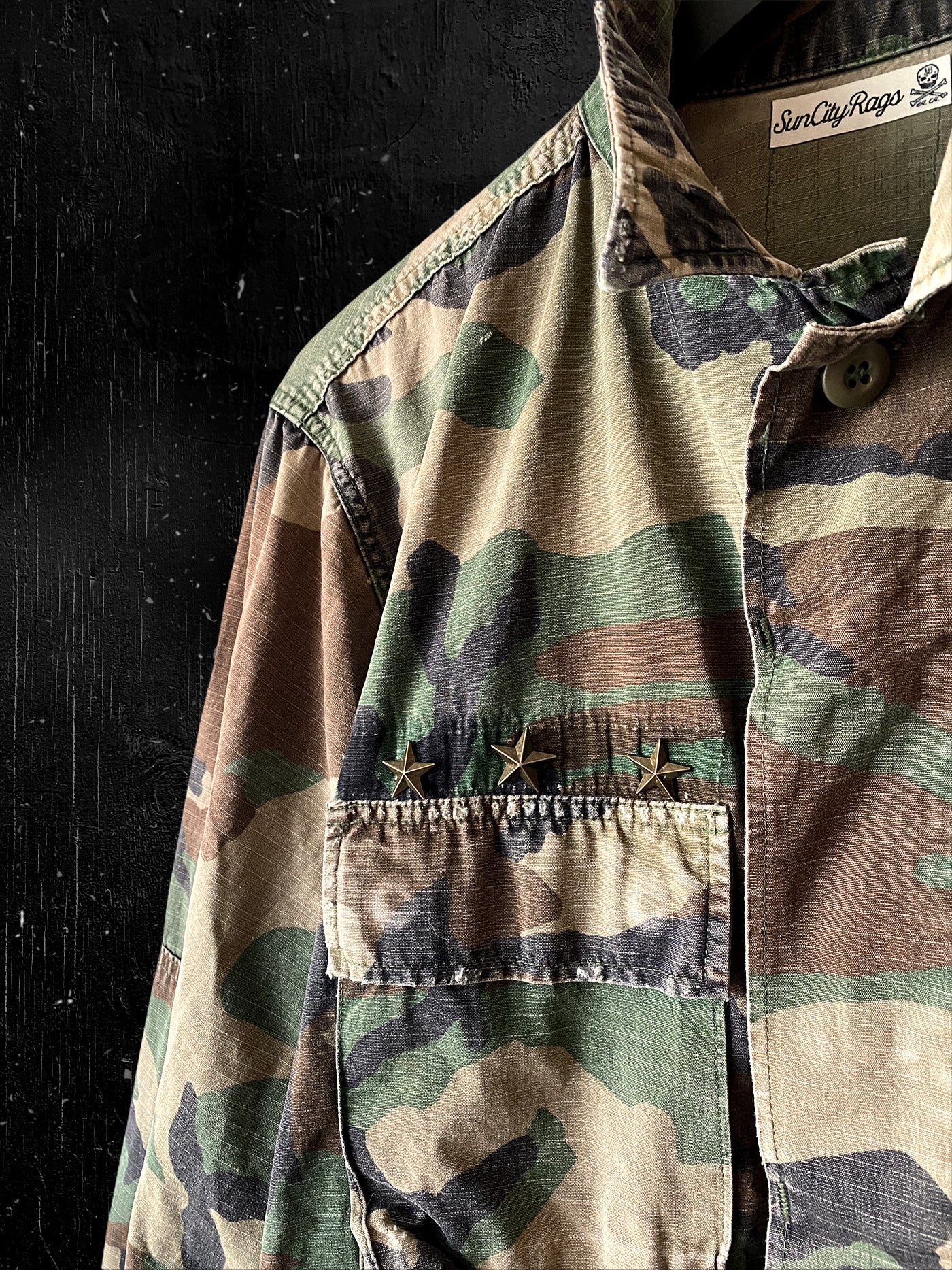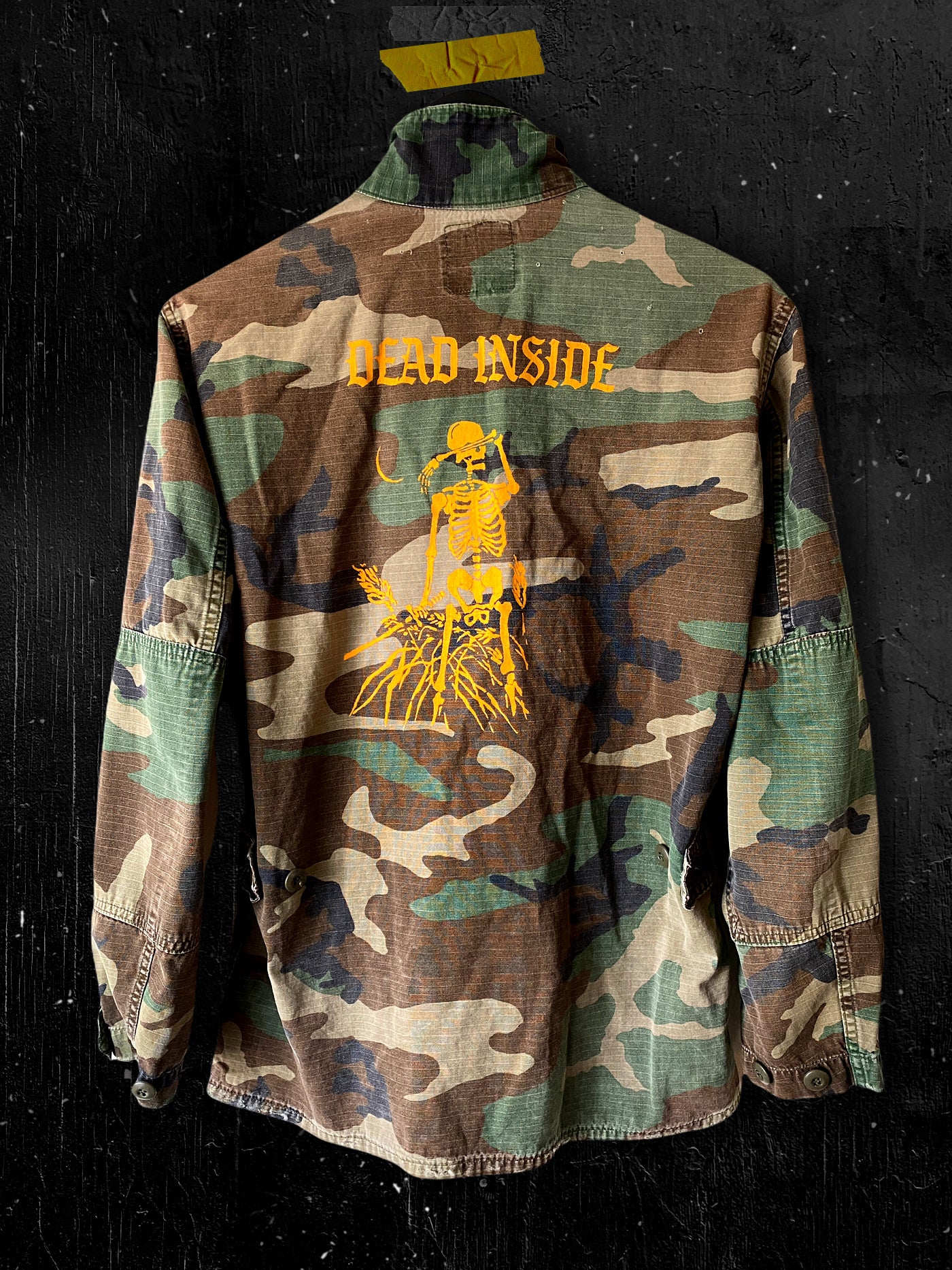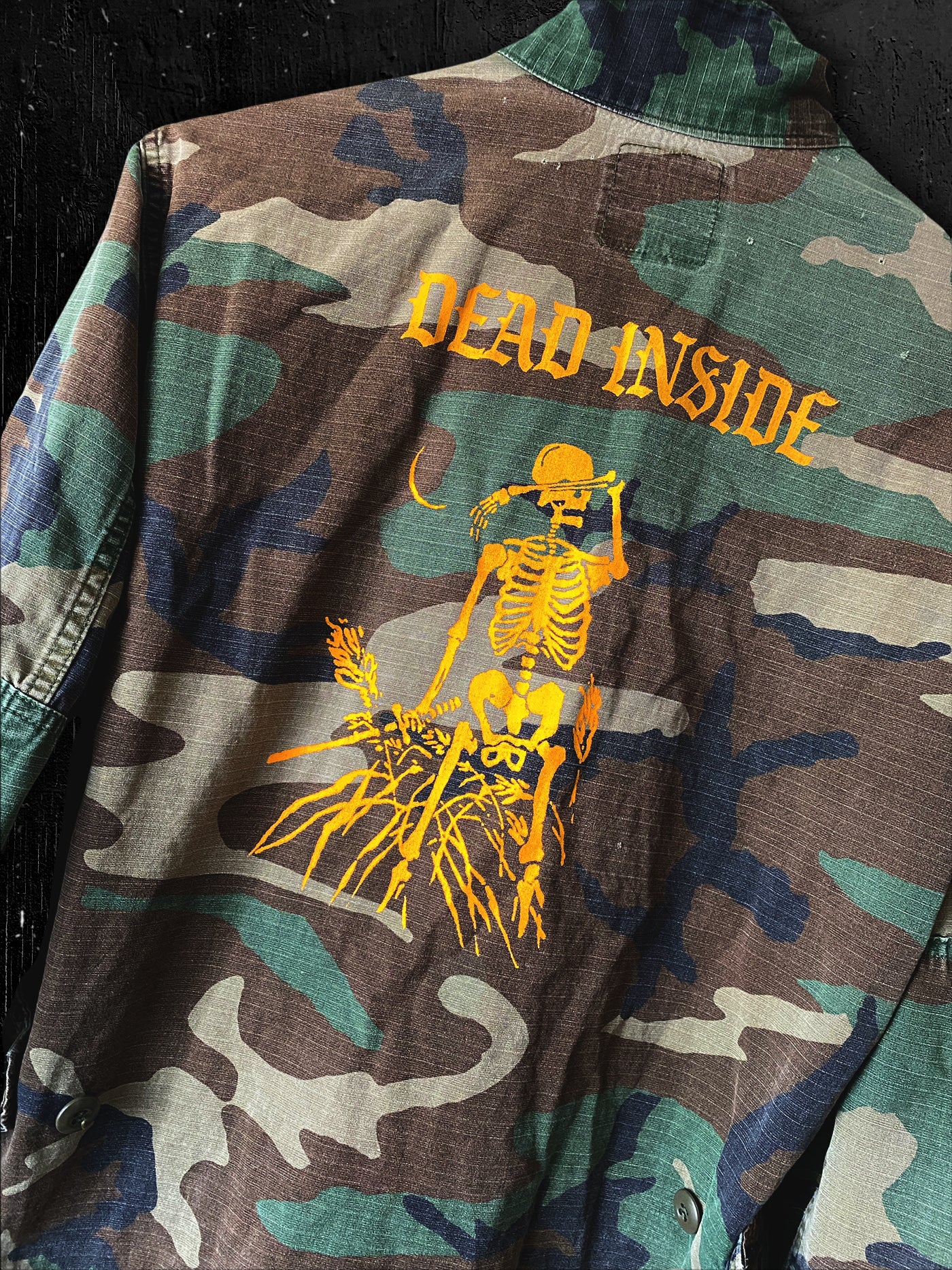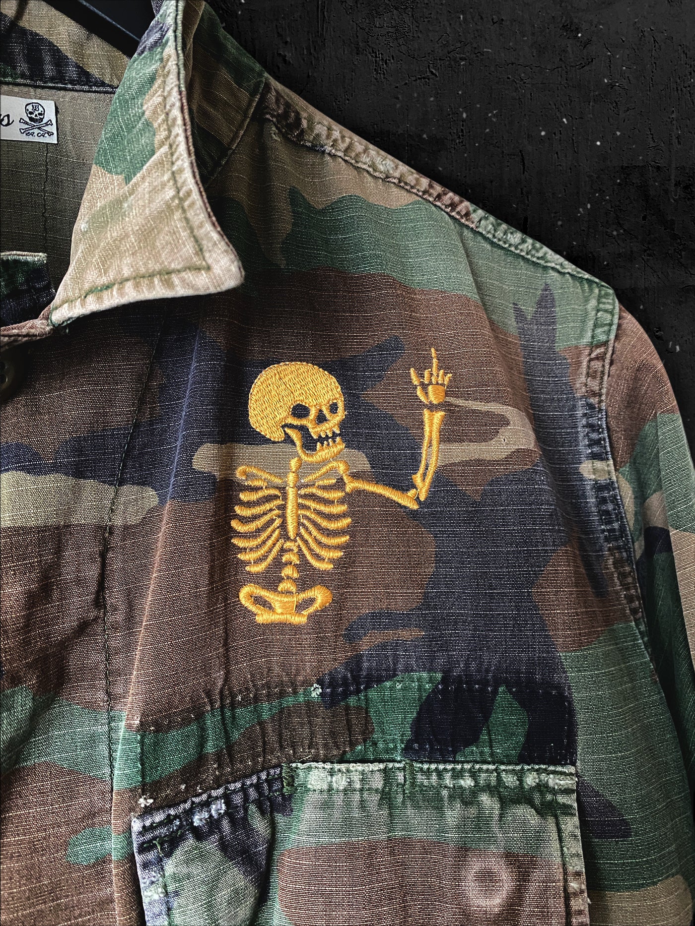 This piece is designed and customized by artist Johnny Smoke. Combining hand pulled prints with custom embroidery on an original vintage camo jacket to create a unique one of a kind wearable piece of art & history.