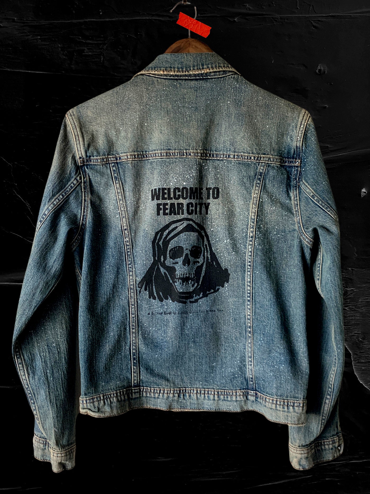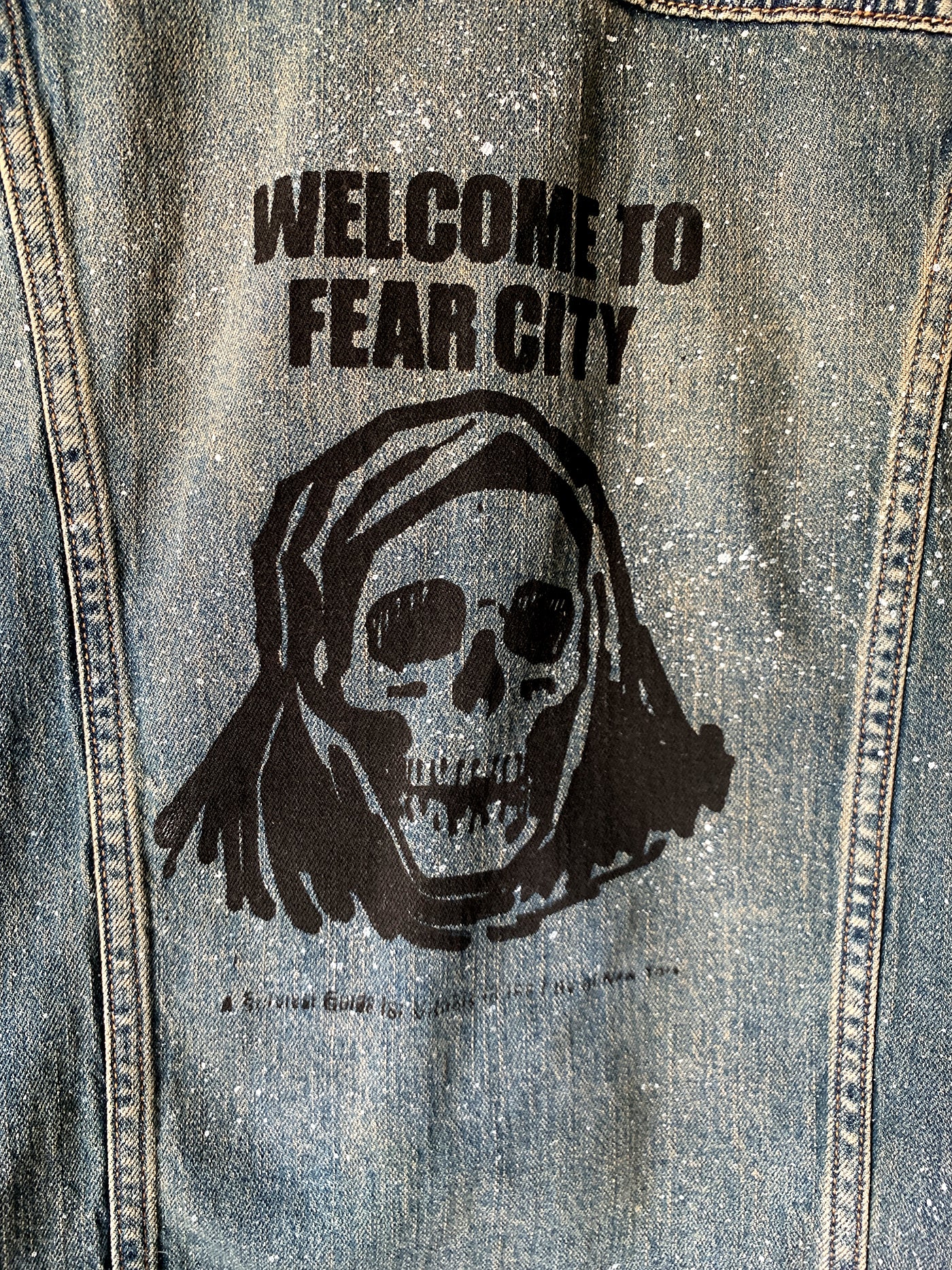 - Hand printed back design featuring "FEAR CITY" the propaganda flyer created by New York Police in the 1970's to scare tourists and pressure the governor for larger police budgets.