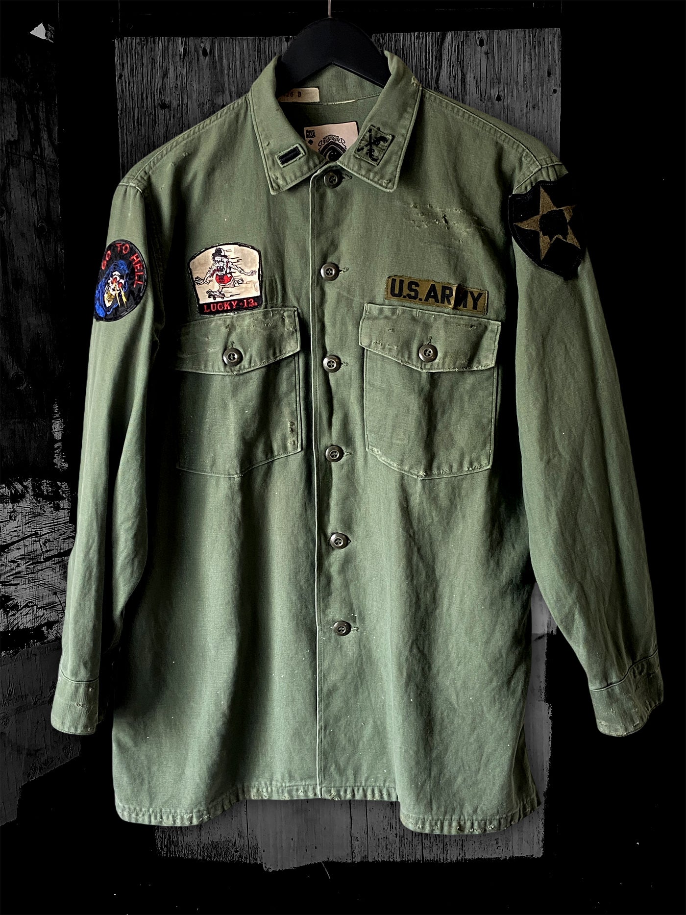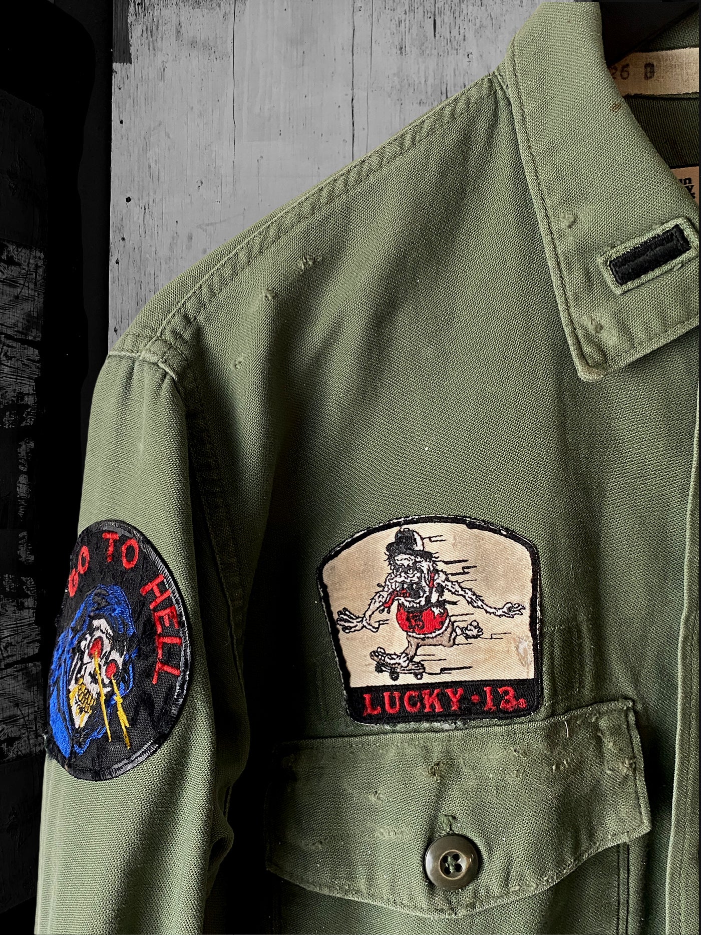 This piece is designed and customized by artist Johnny Smoke. Combining various rare and iconic vintage patches with a 100% original (battle worn) Vietnam war jacket to create a unique one of a kind wearable piece of art & history.