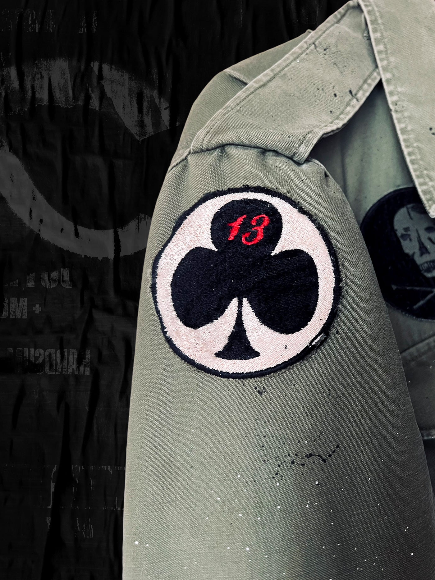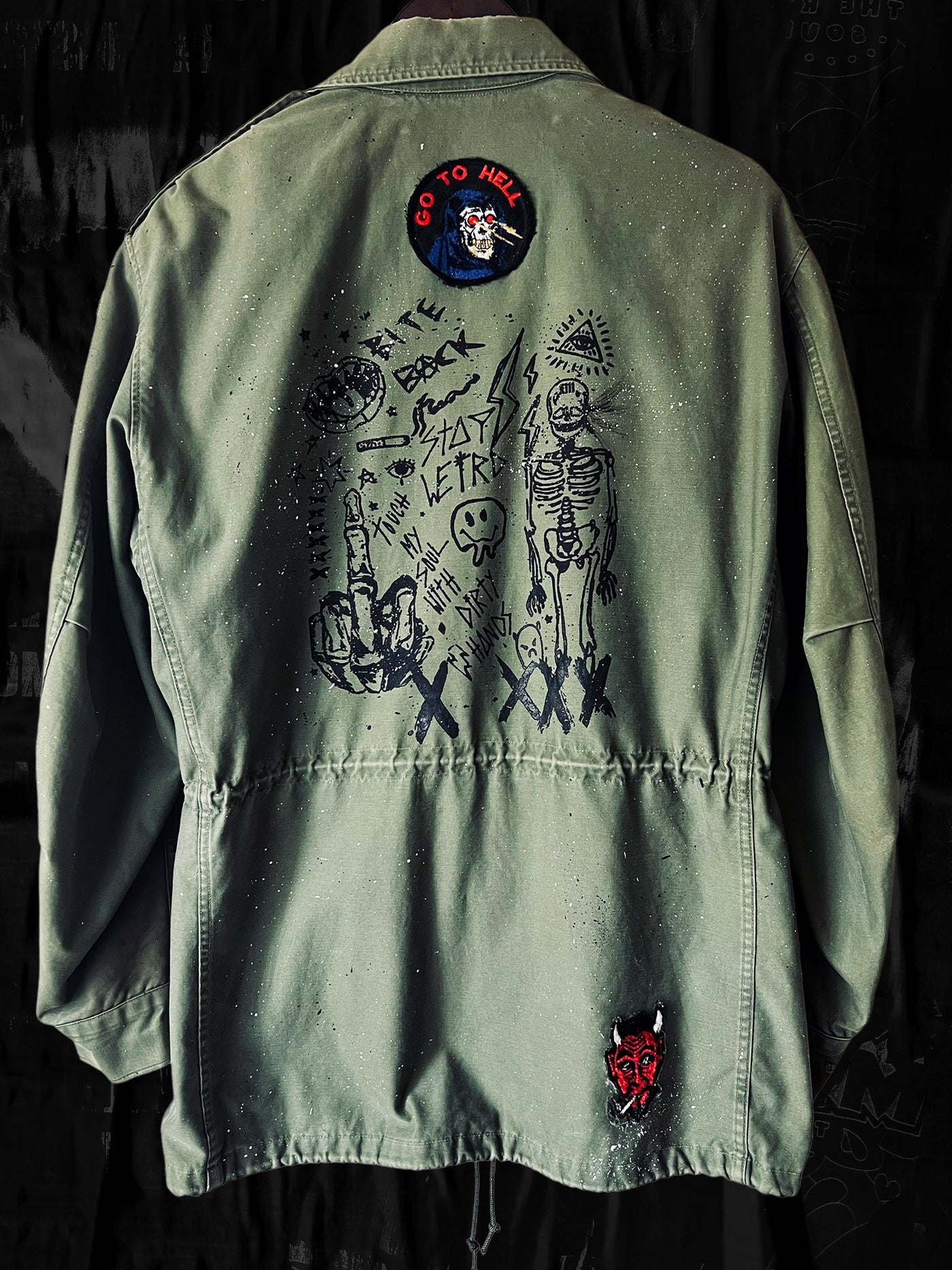 This piece is designed and customized by artist Johnny Smoke. Combining custom embroidery, vintage patches, hand printing on an original vintage M65 Field Jacket to create a unique one of a kind wearable piece of art & history.