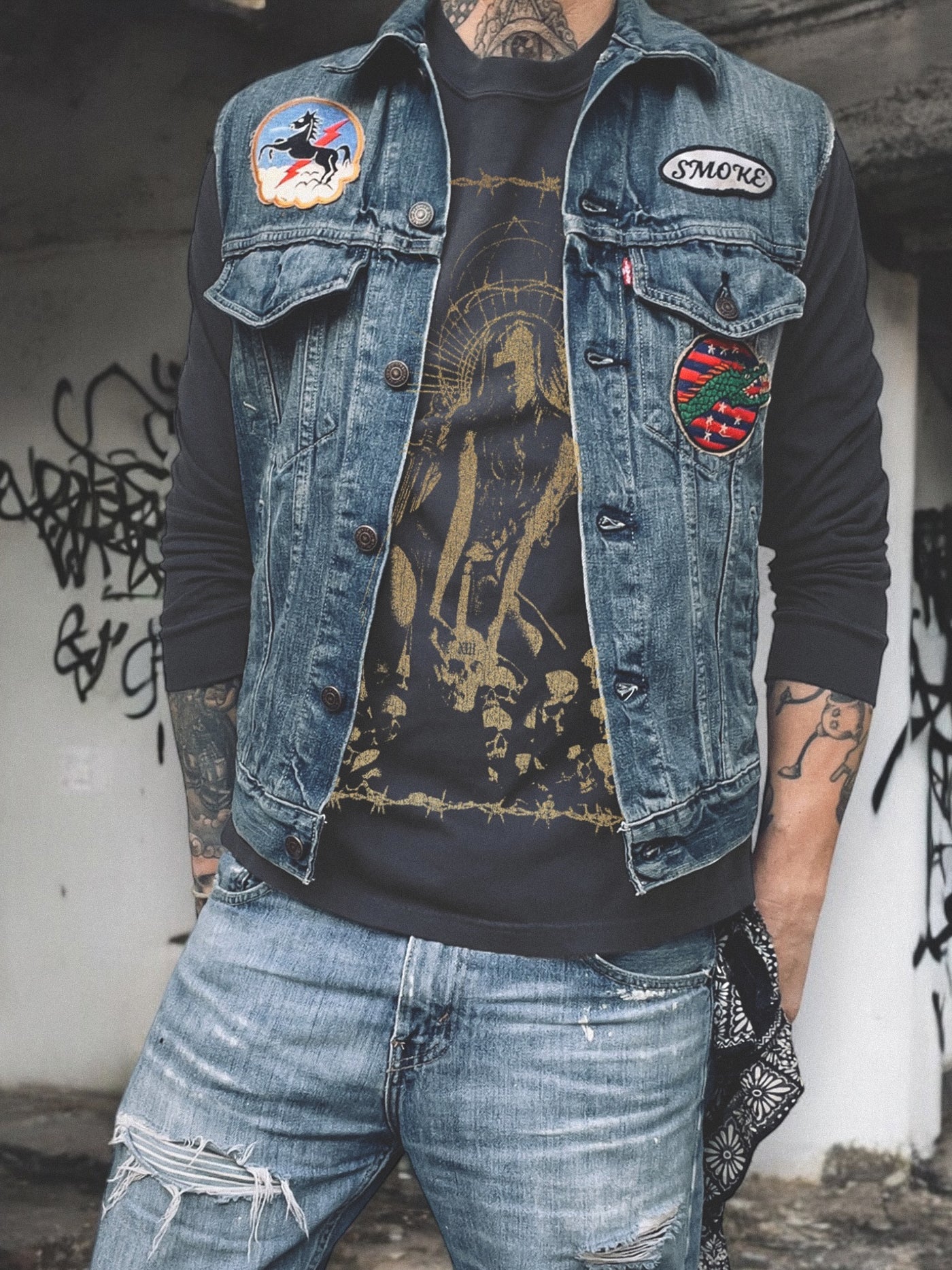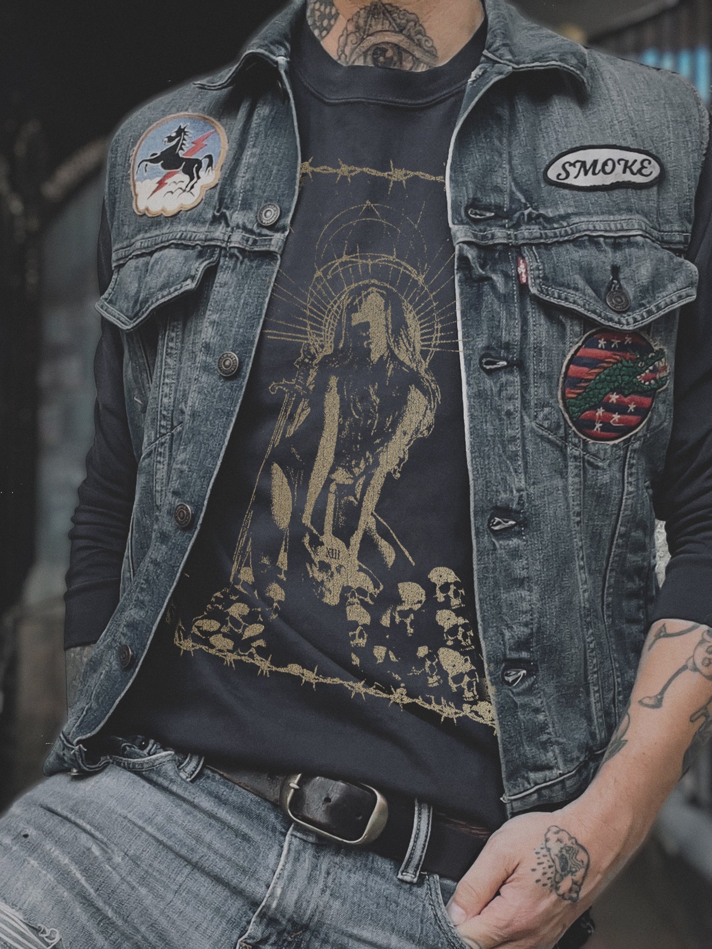 Every piece has been custom dyed, stone washed & adorned with a hand pulled print based on works by artist Johnny Smoke, in special edition metallic gold. Designed to give you the fit and feel of a vintage classic.
