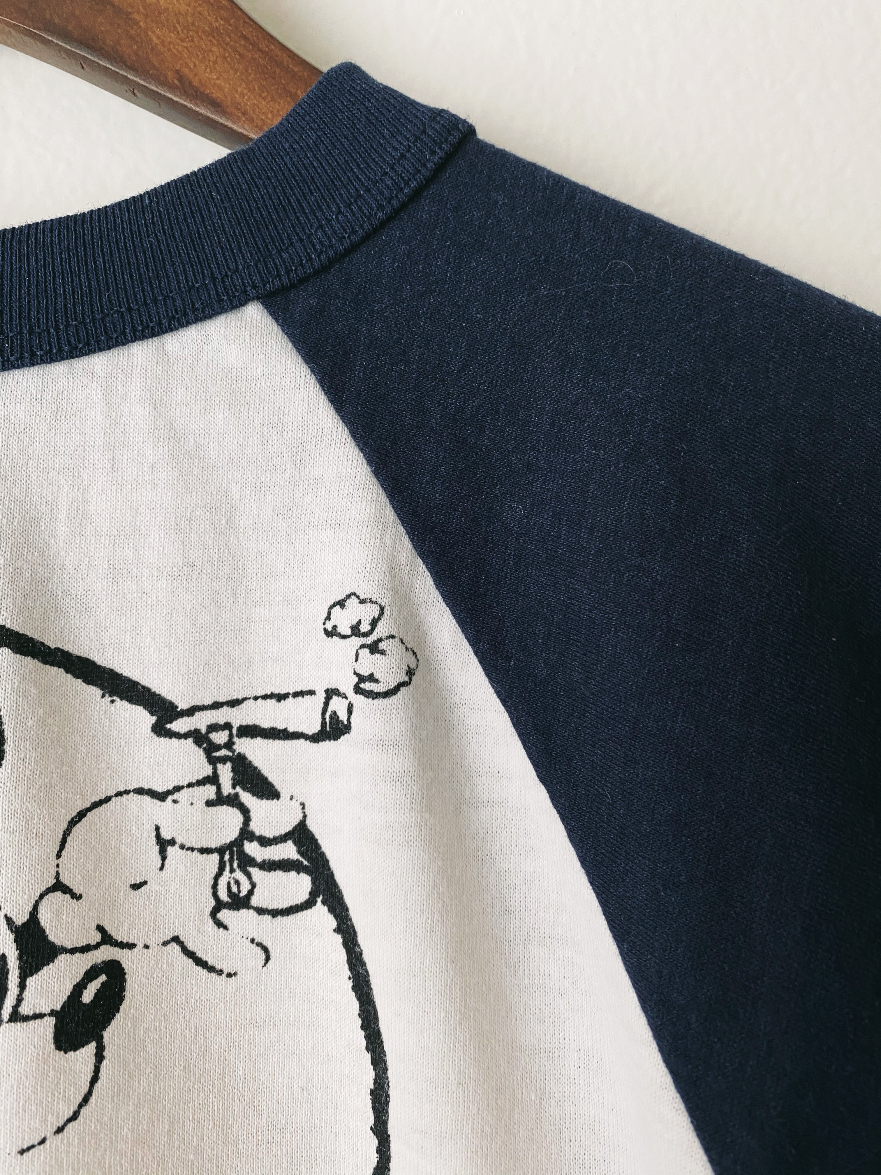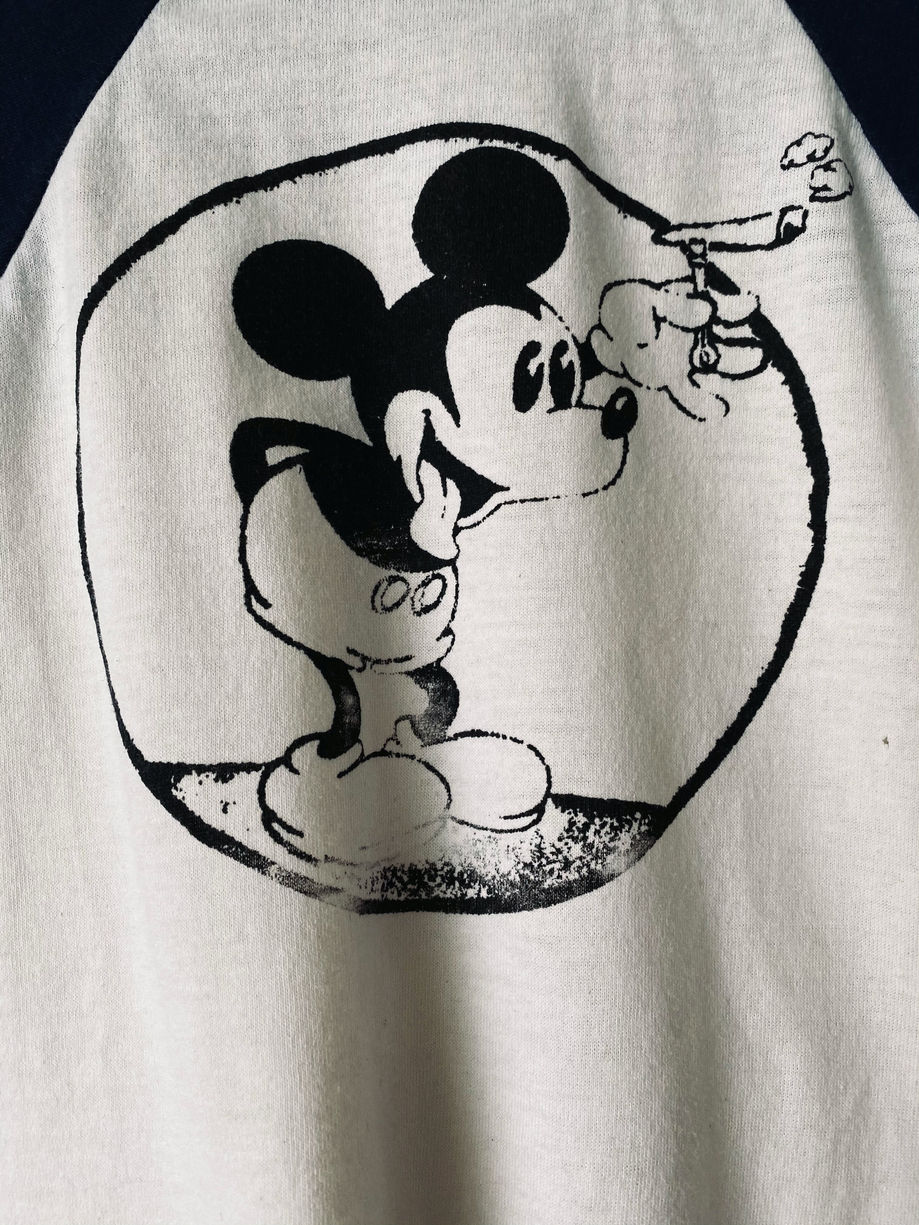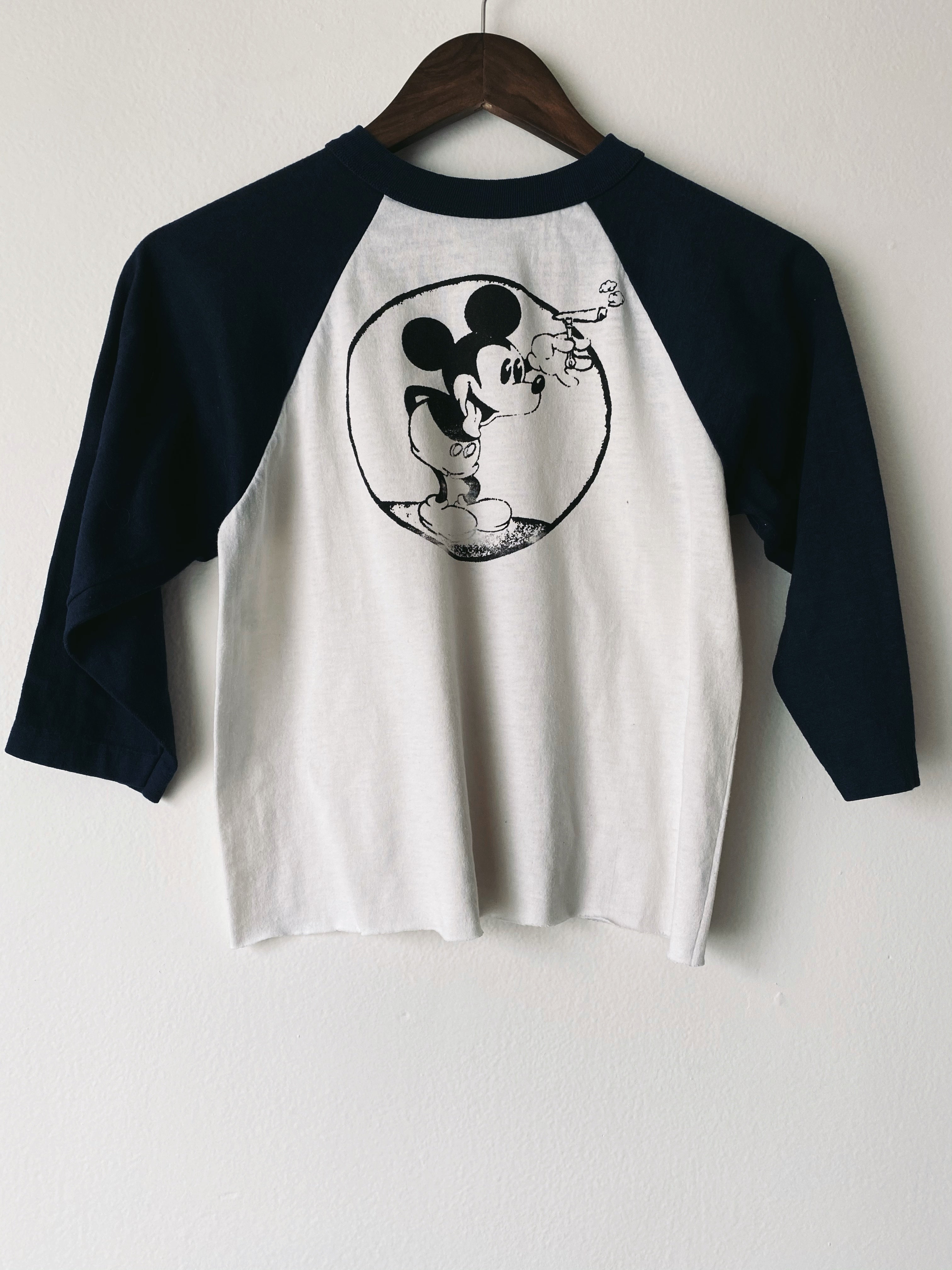 Womens Cropped baseball style t shirt. Hand pulled (Mickey smokin' a doobie) print.
