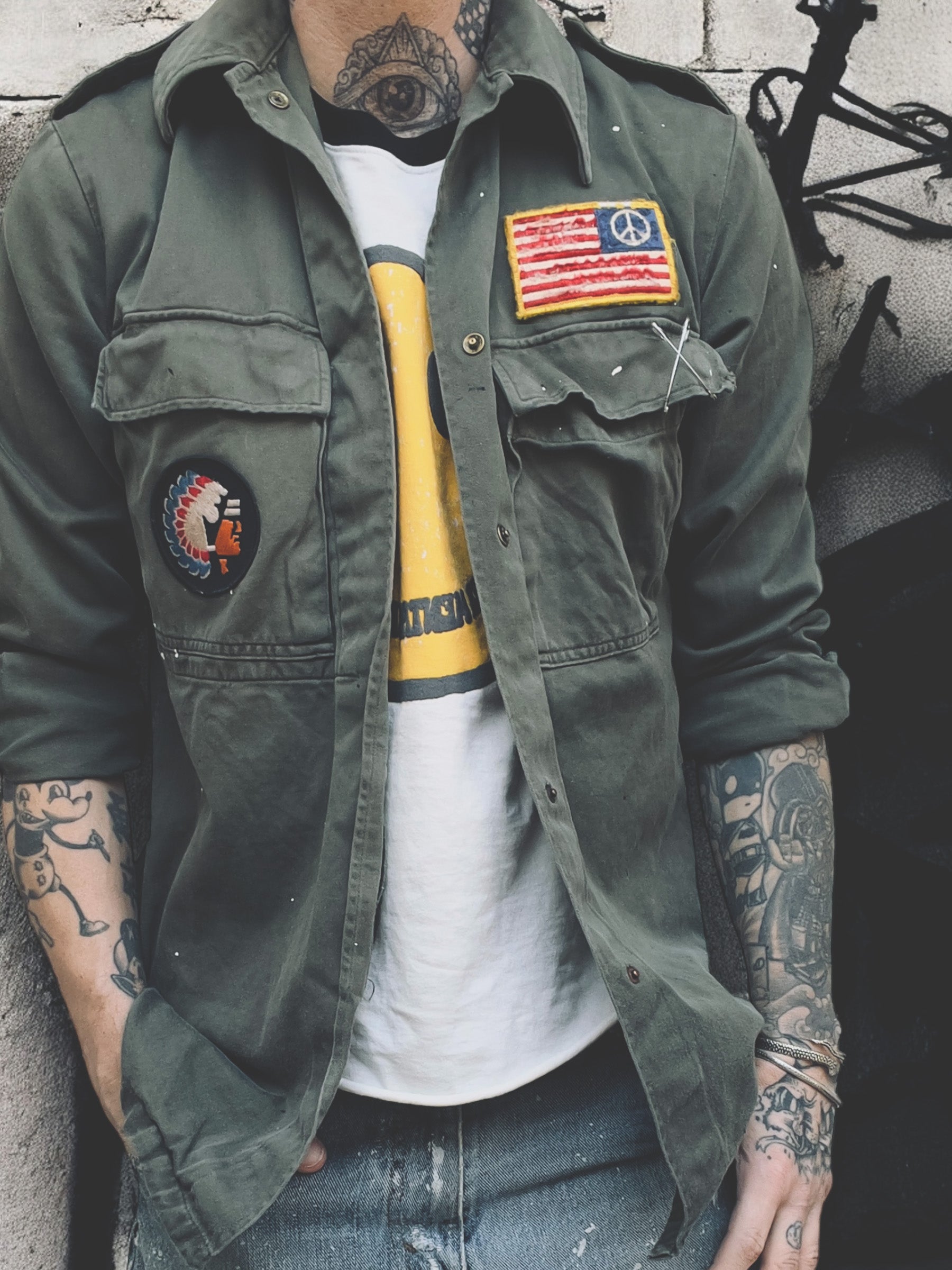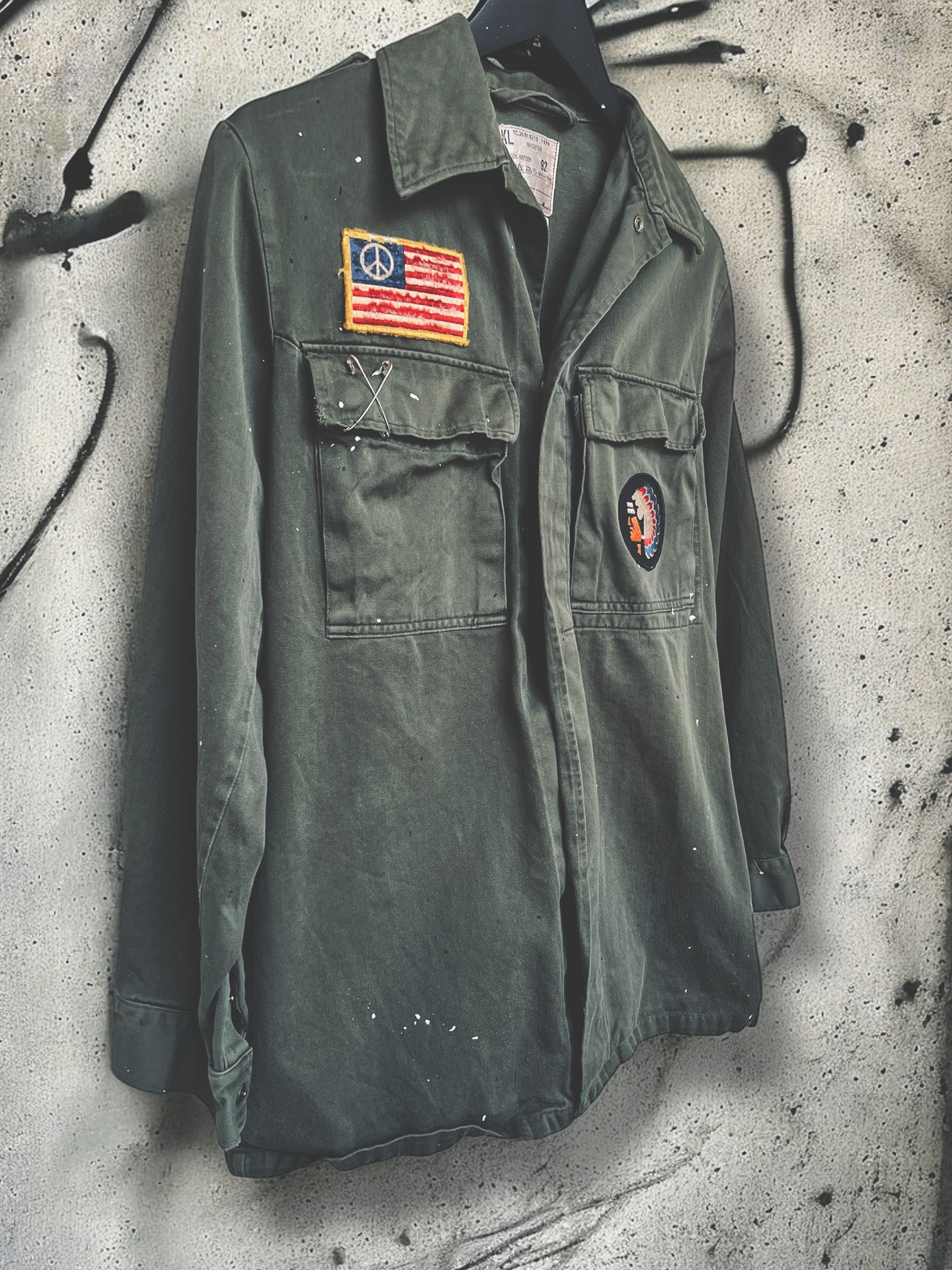 Every detail & placement has been carefully scrutinized; combining hand painted elements with various vintage military & iconic patches on a 100% original 1970's era jacket to create this unique one-of-a-kind wearable piece of art & history.